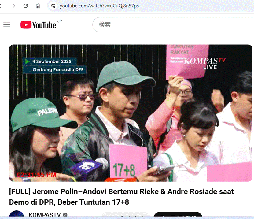 詳細については、以下の動画が参考になります。この動画では、インフルエンサーの Jerome Polin と Andovi da Lopez が、インドネシア議会(DPR)前で、議員 Rieke Diah Pitaloka 氏や Andre Rosiade 氏と面会し、「要求」の原本を直接手渡す様子が報じられました。これは、提出経路に関して言い逃れの余地を与えないための行動でした。